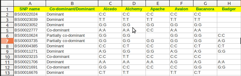 - Clicking on a specific chromosomal images (ideograms) will allow you to save all or the haplotypes for the 69 wheat varieties for each SNP on that chromosome. The spreadsheet also gives position in centimorgans (cM) and describes whether the SNP is dominant, co-dominant or partially co-dominant (a diagrammatic representation of these SNP types can be found here).